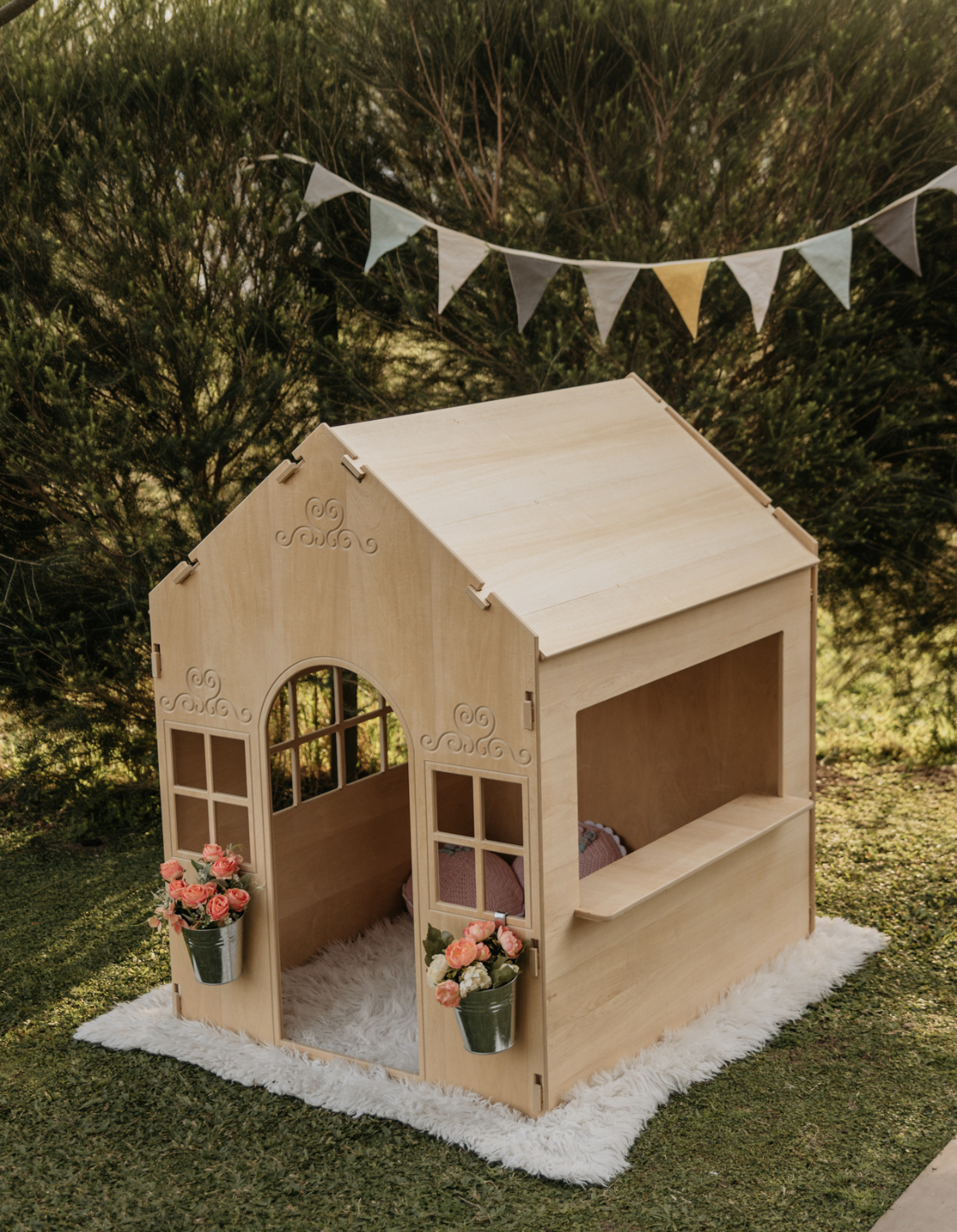 🏠Está casita está realizada en melamina enchapada en madera de guatambú de 2cm con terminación de laca para evitar astillas de la madera.
