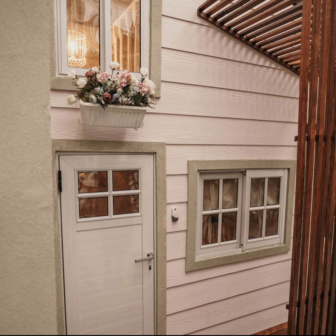 Cara exterior compuesta por placas hidrófugas tipo T-plak (resina epoxi y el material del reciclado de cajas de tetra brick) con terminación de pintura plástica tipo “Tarquini” en colores a elección que le da una terminación más de casita de cemento. Si queres que parezca y se asemeje a la madera podemos hacerla o combinarla con las placas de la línea “Cedral” de Durlock (que de cotizan aparte) y las que te dan la calidez de la madera sin el mantenimiento natural!